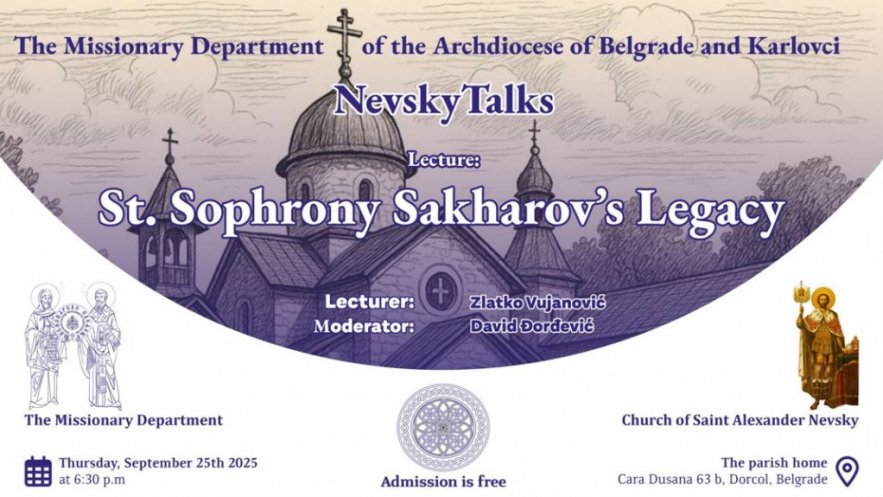 У четвртак, 25. септембра у 18.30 часова, у парохијском дому при Храму Светог Александра Невског на Дорћолу биће одржано предавање на енглеском језику под називом „St. Sophrony Sakharov’s Legacy“. Предавач је Златко Вујановић, а модератор Давид Ђорђевић. Догађај организује Мисионарско одељење Архиепископије београдско-карловачке. Улаз је слободан.