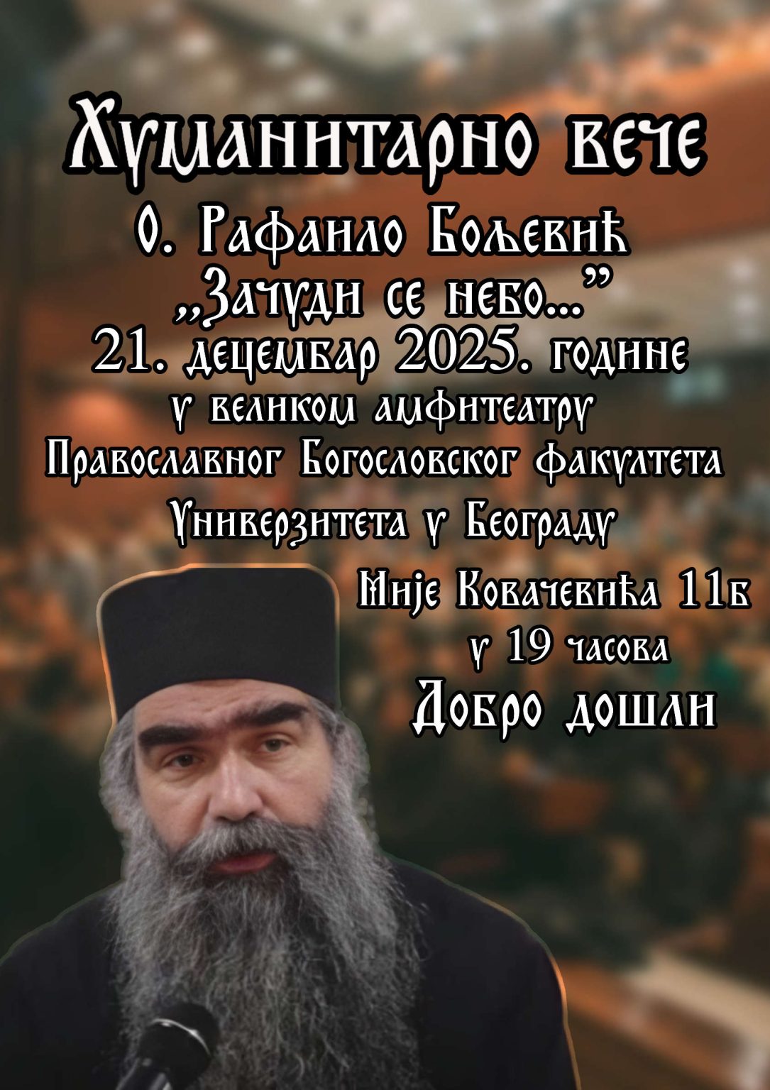 У недељу, 21. децембра текуће године, са почетком у 19.00 часова, у Великом амфитеатру Православног богословског факултета Универзитета у Београду, отац Рафаило Бољевић одржаће предавање на тему: „Зачуди се небо…“. Вече ће бити хуманитарног карактера. Добро дошли!