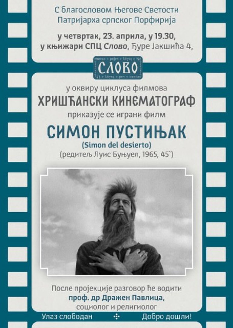У четвртак, 23. априла, у књижари Српске Православне Цркве Слово, Ђуре Јакшића 4, у 19.30, у оквиру циклуса „Хришћански кинематограф", биће приказан играни филм „Симон пустињак" (1965, 45`) редитеља Луиса Буњуела. После пројекције разговор о филму водиће проф. др Дражен Павлица, социолог и религиолог. Улаз је слободан. Добродошли!