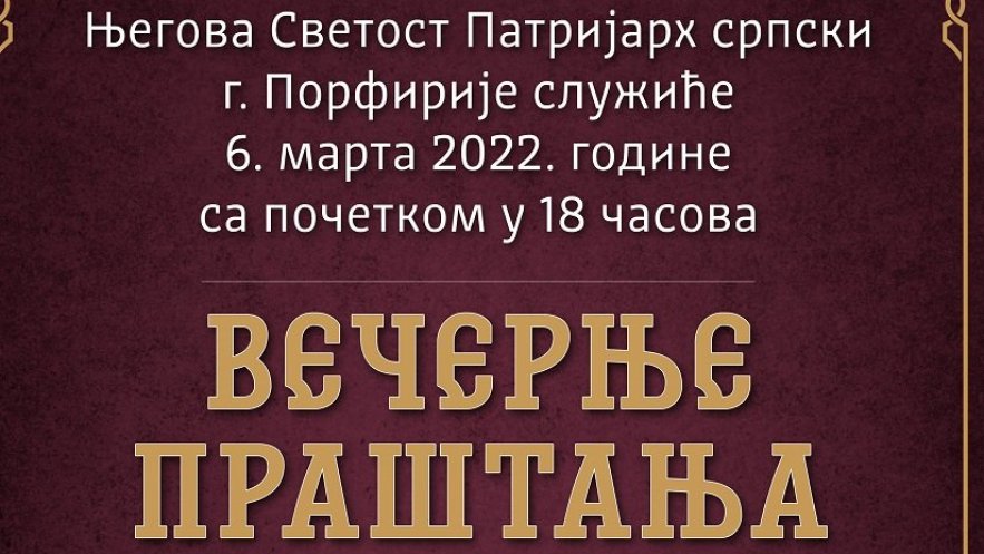 Инфо-служба СПЦТим поводом Његова Светост Патријарх позива верни народ да учествује у древном богослужењу којим Црква улази у Велики и Часни пост: - Затражимо опроштај и опростимо једни другима како бисмо међусобно измирени ступили на пут великопосног подвига заједно корачајући ка радости Васкрсења Христова.