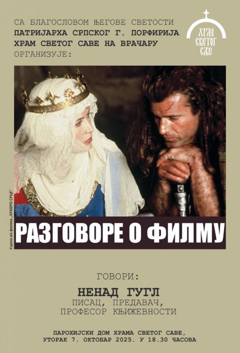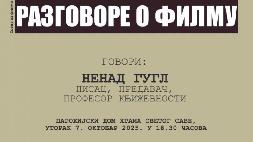 О филму ће говорити Ненад Гугле, писац, предавач и професор књижевности, аутор емисије на Телевизији Храм. Разговор ће се одржати у уторак, 7. октобра 2025. године, у 18.30 часова, у Парохијском дому Храма Светог Саве. Улаз је слободан.