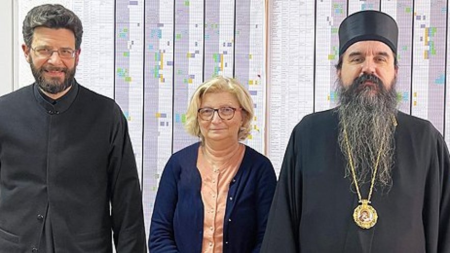 Владику Јеротеја су дочекали в.д директора Драгана Таталовић и вероучитељица Милана Ивковић са сарадницима. У срдачном разговору са директором Десете гимзаије епископ Јеротеј се упознао са начином организовања и извођења верске наставе, као и радом школе која је добила акредитацију за увођење програма Интернационалне дипломе (International Baccalaureate Diploma Programme – IBDP) и тако постала прва и за сада једина државна школа у Београду ауторизована да спроводи тај образовни програм.