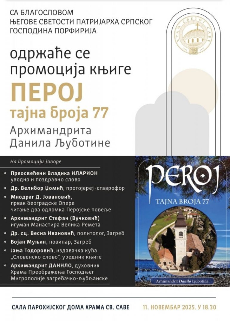 Са благословом Његове Светости Патријарха српског господина Порфирија, у сали парохијског дома Храма Светог Саве одржаће се промоција књиге Перој – тајна броја 77 архимандрита Данила Љуботине, духовника Храма Преображења Господњег Митрополије загребачко-љубљанске. На промоцији ће говорити Преосвећени владика Иларион, који ће одржати уводно и поздравно слово, др Велибор Џомић, протојереј-ставрофор, Миодраг Д. Јовановић, првак београдске Опере, који ће прочитати два одломка Перојске повеље, архимандрит Стефан (Вучковић), игуман Манастира Велика Ремета, др сц. Весна Ивановић, политиколог из Загреба, Бојан Муњин, новинар из Загреба, Јања Тодоровић, уредник издавачке куће „Словенско слово“, као и аутор, архимандрит Данило. Модератор догађаја биће главни и одговорни уредник телевизије Храм и Радија Слово љубве Сања Лубардић.