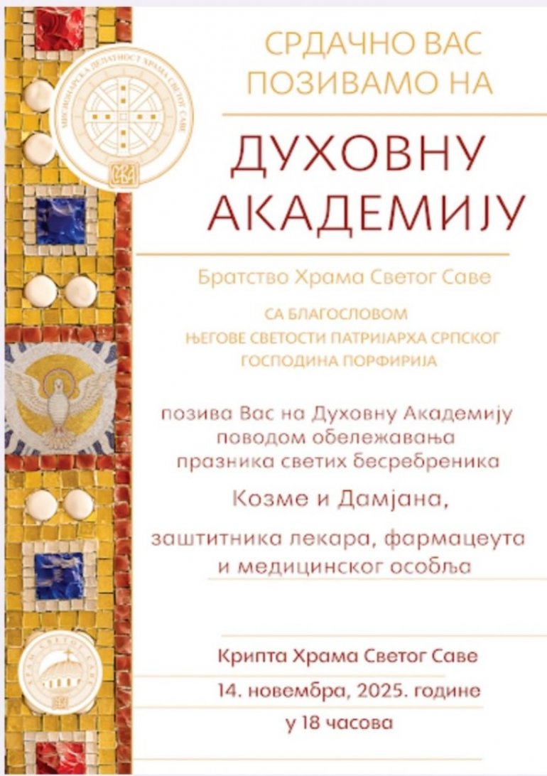 Истог дана, у крипти Храма Светог Саве, братство храма организује Духовну академију поводом празника Светих бесребреника Козме и Дамјана, заштитника лекара, фармацеута и медицинског особља. Академија ће бити одржана са благословом Његове Светости Патријарха српског г. Порфирија, са почетком у 18 часова.