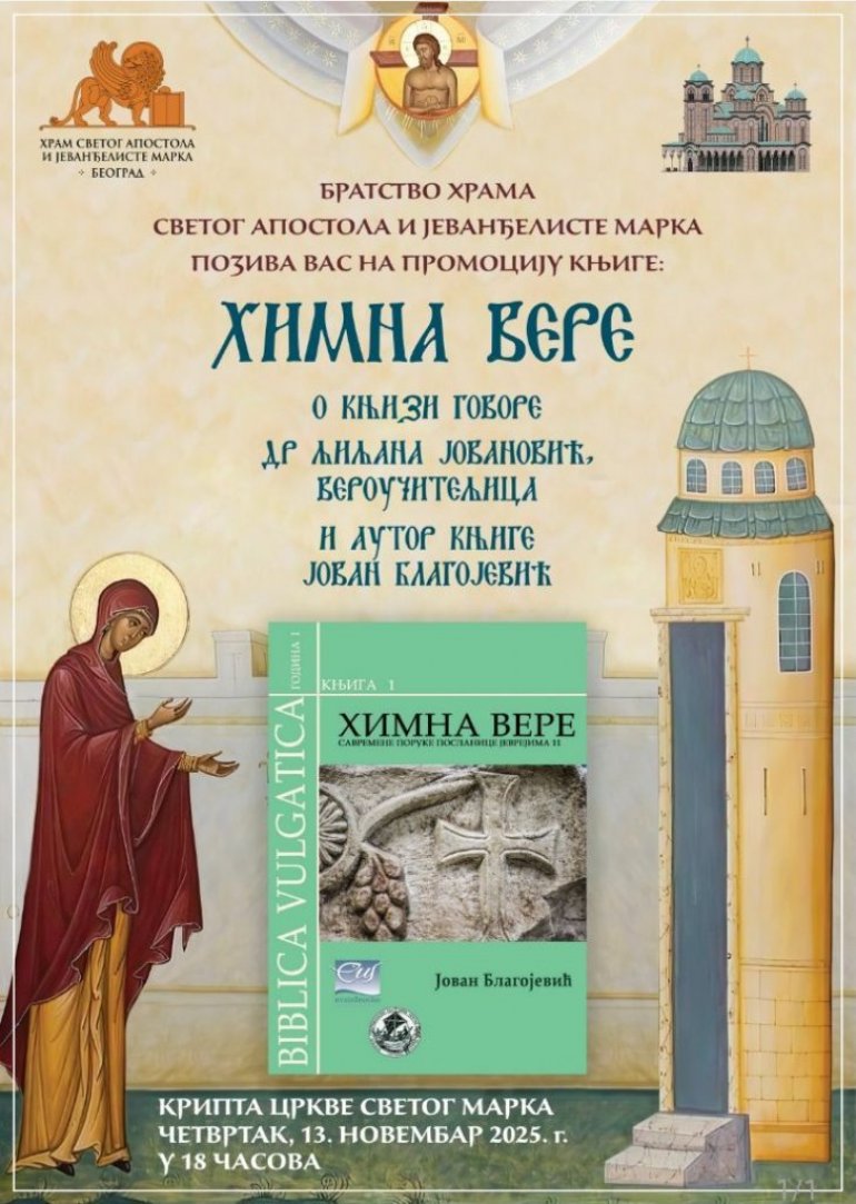 У четвртак, 13. новембра, у крипти Храма Светог апостола и јеванђелисте Марка, биће представљена књига „Химна вере“ аутора Јована Благојевића. О делу ће, поред аутора, говорити и др Љиљана Јовановић, вероучитељица. Почетак је у 18 часова.