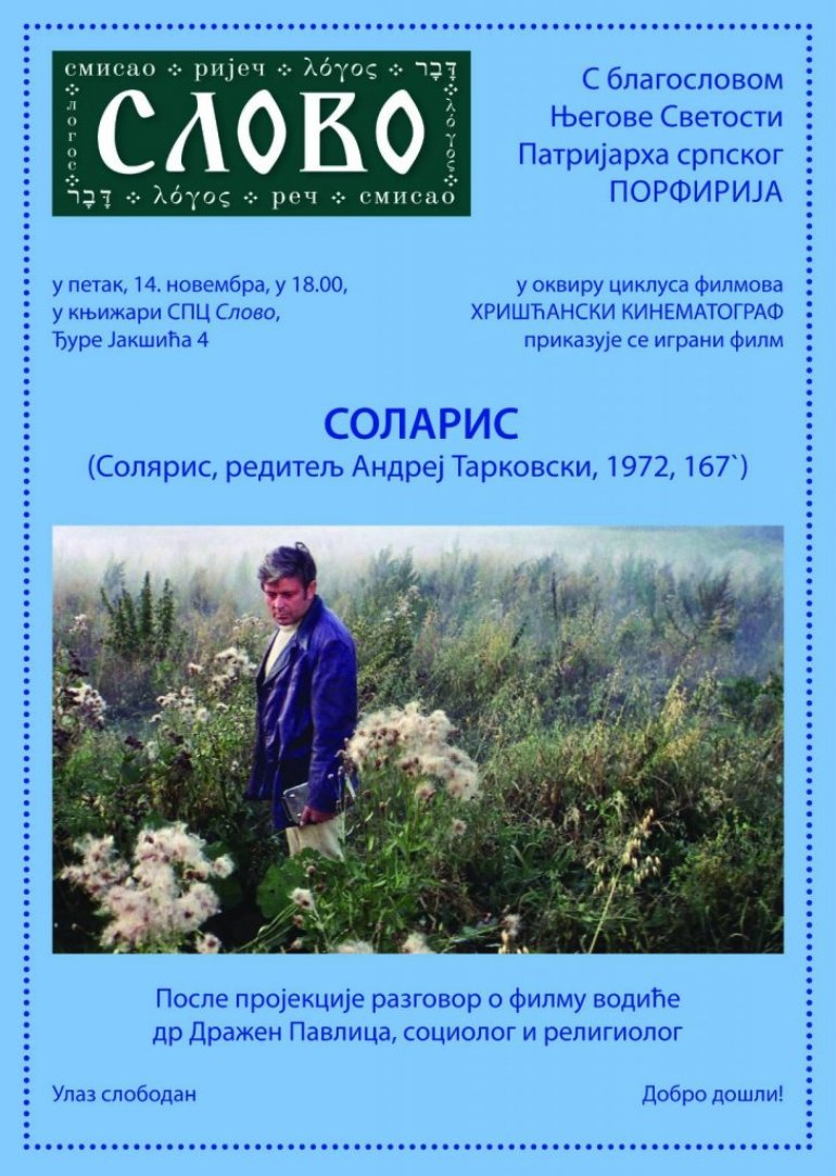 У књижари СПЦ „Слово“ (Ћуре Јакшића 4) биће приказан чувени филм „Соларис“ редитеља Андреја Тарковског, у оквиру циклуса Хришћански кинематограф. После пројекције разговор о филму водиће др Дражен Павлица, социолог и религиолог. Улаз је слободан.