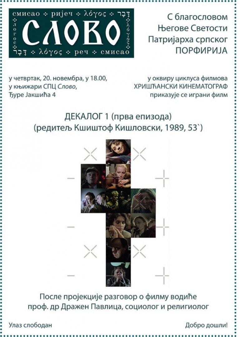 У четвртак, 20. новембра, са почетком у 18 часова у књижари "Слово" (ул. Ђуре Јакшића 4), у оквиру циклуса филмова "Хришћански кинематограф" биће приказана прва епизода играног филма "Декалог" редитеља Кшиштофа Кишловског из 1989. године. Разговор о филму ће са посетиоцима водити проф. др Дражен Павлица, социолог и религиолог.