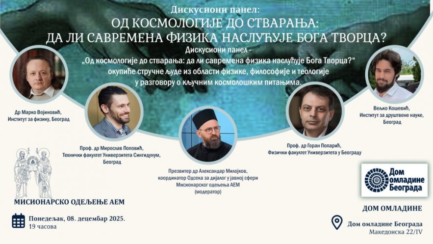 Дискусиони панел – „Од космологије до стварања: да ли савремена физика наслућује Бога Творца?“ окупиће стручне људе из области физике, философије и теологије у разговору о кључним космолошким питањима. Разматраће се актуелност класичних философских доказа о постојању Бога, савремени космолошки модели и домети Теорије великог праска, као и значење појмова као што су „ништа“ (ex nihilo), енергија, квантни вакуум, квантно поље, виртуелне честице, хаос и библијско tohu–va–bohu. Посебна пажња биће посвећена границама научног метода и тачки у којој научни модели прелазе у метафизику. Циљ панела је да отвори дијалог и испита у којој мери су физика, философија и теологија комплементарне у разумевању почетка света и места човека у космосу.