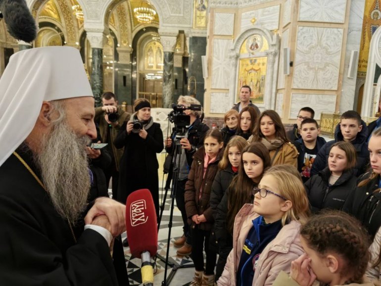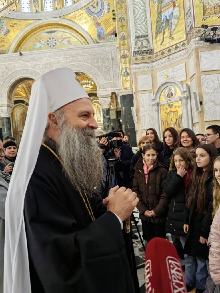 Његова Светост Патријарх српски г. Порфирије угостио је у Храму Светог Саве у Београду децу из региона, Приједора, Грахова, Добоја и Херцег Новог, узраста од 9 до 14 година, у присуству министра за рад, запошљавање, борачка и социјална питања Милице Ђурђевић Стаменковски.