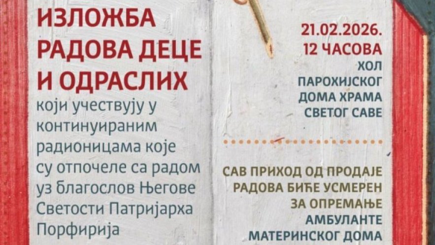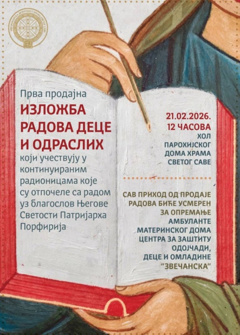 У холу Парохијског дома Храма Светог Саве у Београду, у суботу 21. фебруара са почетком у 12 часова, биће одржана прва продајна изложба радова деце и одраслих који учествују у континуираним радионицама покренутим уз благослов Његове Светости Патријарха српског г. Порфирија. Сав приход од продаје радова биће усмерен за опремање амбуланте Материнског дома Центра за заштиту одојчади, деце и омладине „Звечанска“.