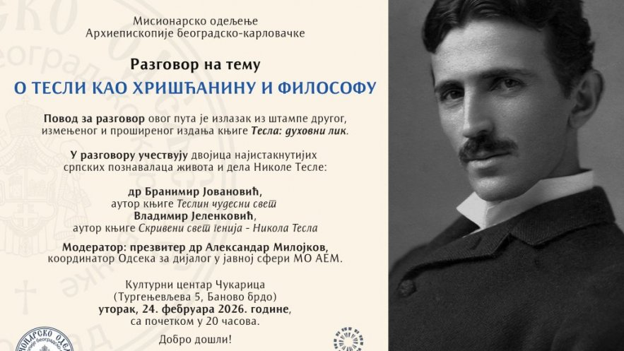 На трибини под називом „О Тесли као хришћанину и философу“ биће речи о мање познатој, али суштински важној димензији лика и дела генијалног српског проналазача, у настојању да се обради тема научног генија као човека кога су обележили како хришћанско порекло и надахнуће, тако и разнa философска трагања и размишљања.