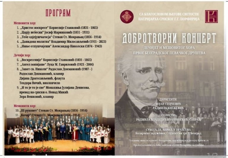 Концерт ће бити одржан у суботу, 18. априла, са почетком у 19 часова, у великој сали Коларчеве задужбине.