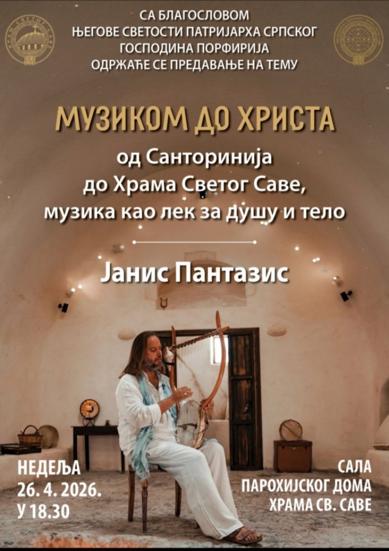 Са благословом патријараха српског, у недељу од 18 часова и 30 минута у Парохијском дому на Врачару биће одржано предавање "Музиком до Христа - од Санторинија до Храма Светог Саве, музика као лек за душу". Предавач је грчки уметник Јанис Пантазис, а улаз је слободан.