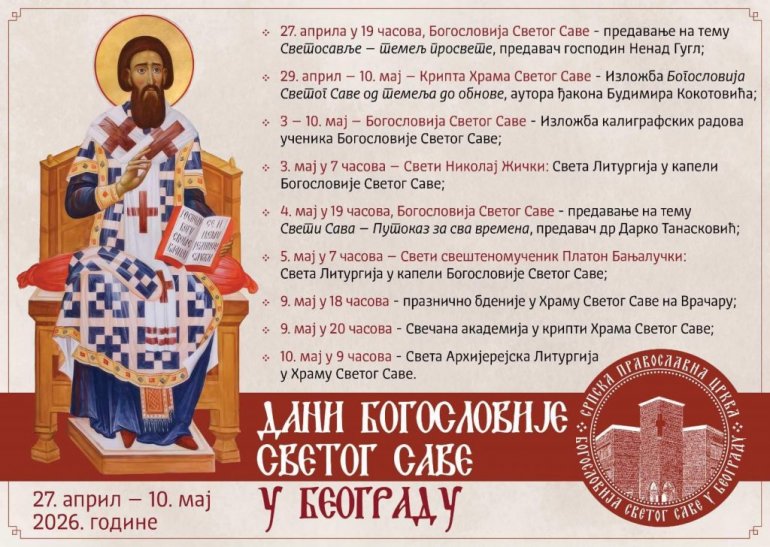 Уочи школске славе, 9. маја 2026. године, у крипти храма Светог Саве биће одржана свечана академија са почетком у 20 часова. На дан молитвеног сећања на Спаљивање моштију Светог Саве света архијерејска Литургија у храму Светог Саве на Врачару биће служена са почетком у 9 часова.