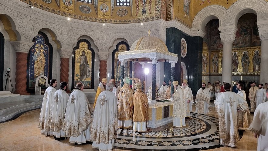 Патријарху Порфирију саслуживали су Преосвећена Господа епископи новограчаничко-средњезападноамерички Лонгин, британско-скандинавски Доситеј, западноамерички Максим, источноамерички Иринеј, викарни епископи Патријарха српског ремезијански Стефан, топлички Јеротеј, хвостански Јустин, марчански Сава, умировљени канадски Георгије, свештеномонаштво, свештенство и ђаконство у молитвеном присуству верног народа и уз молитвено појање хорова храма Светог Саве под диригентском палицом Катарине Станковић.